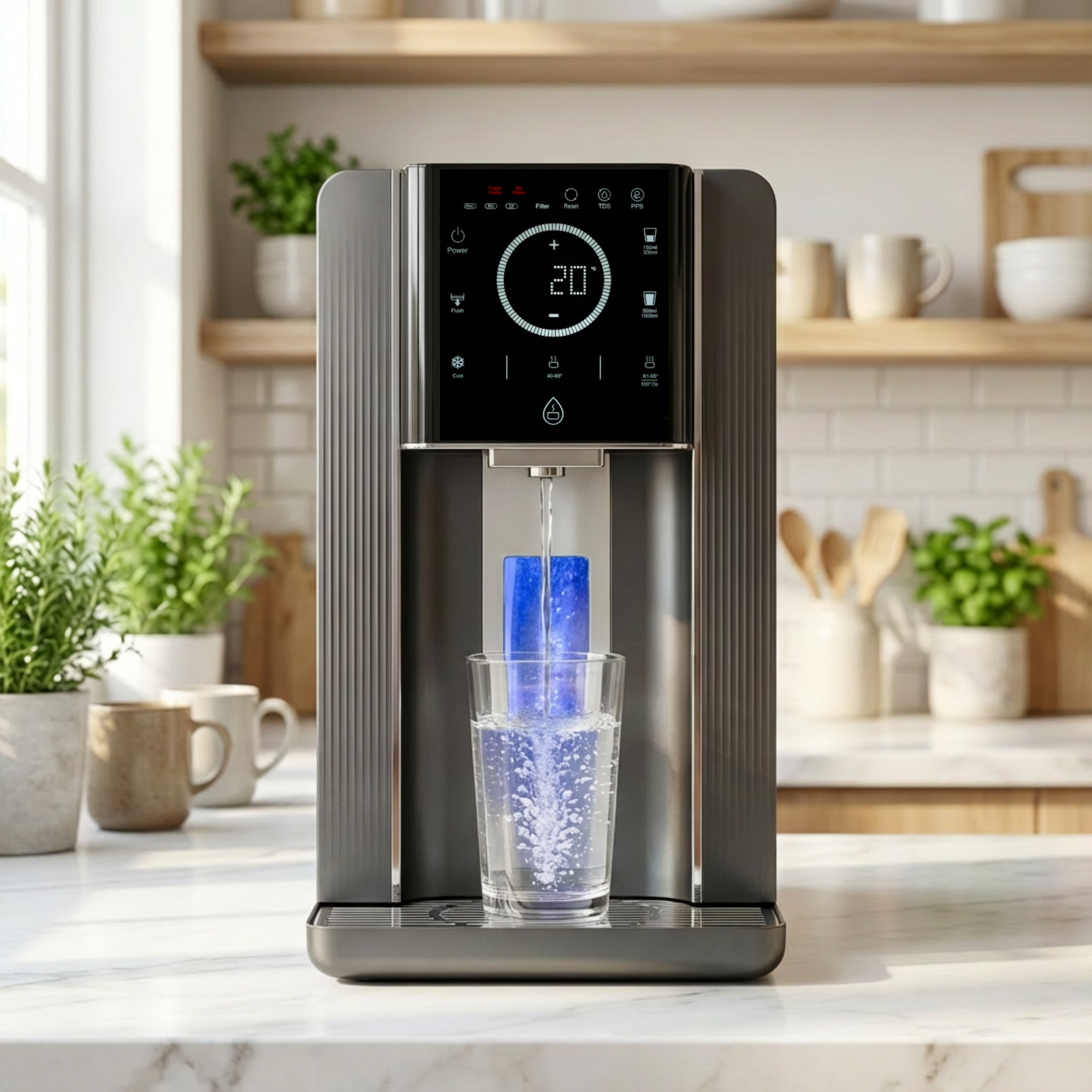 Ein moderner Wasserfilter, der Technik und Design verbindet.